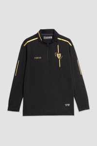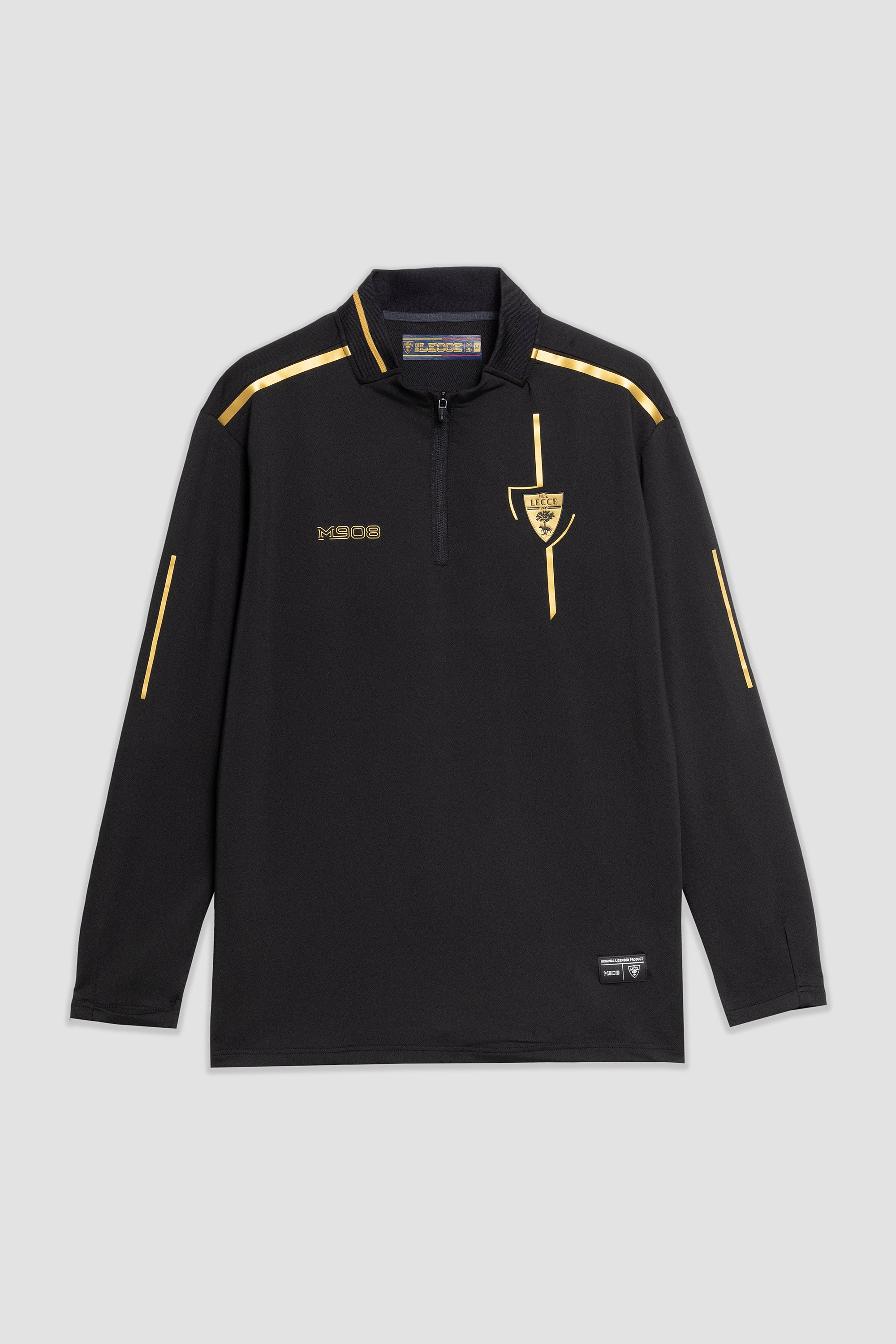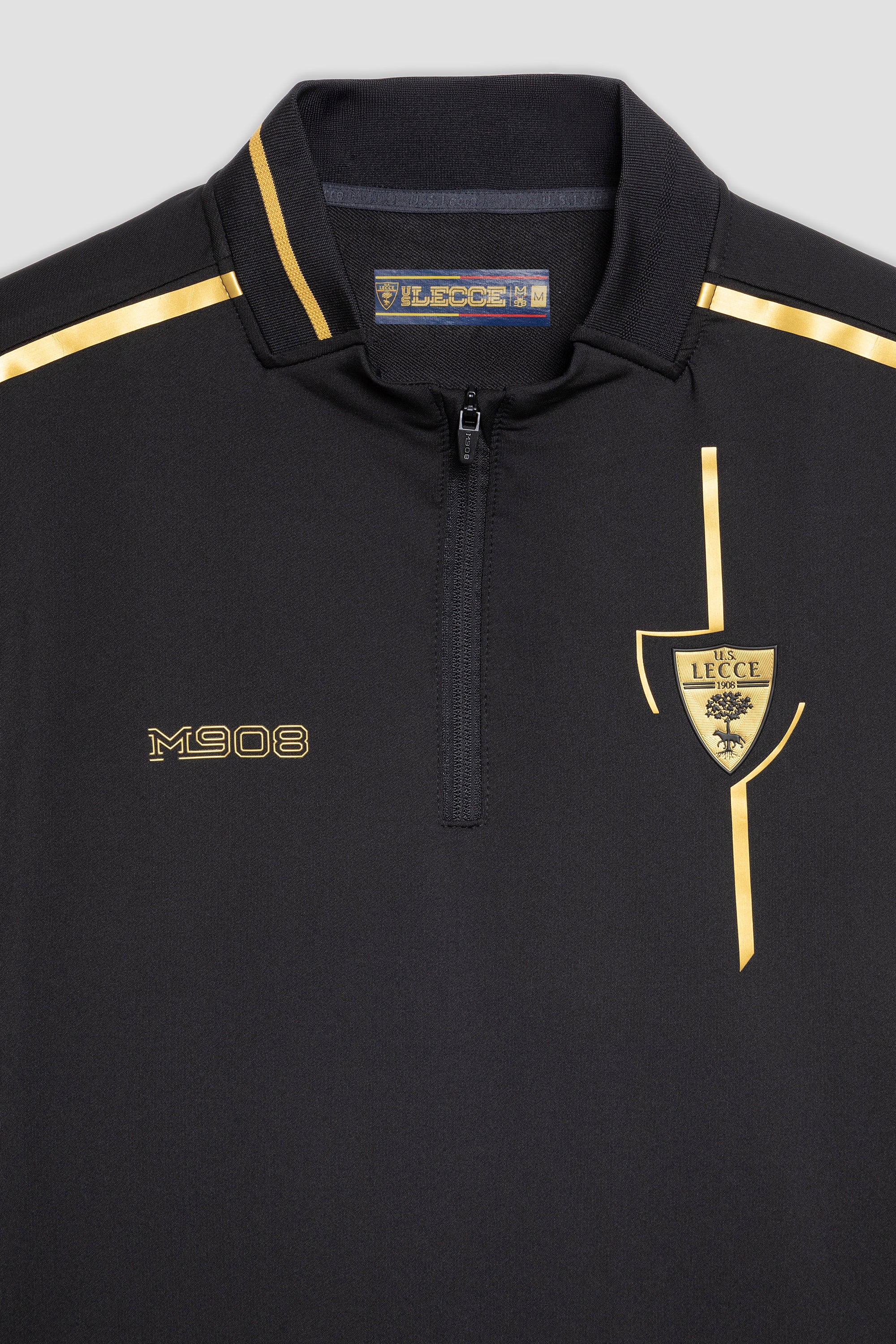 It features a half-zip collar and is highlighted by gold, yellow, and tonal lines on the sleeves and collar. The chest showcases the M908 logo and U.S. Lecce crest, integrated into a sleek vertical graphic.