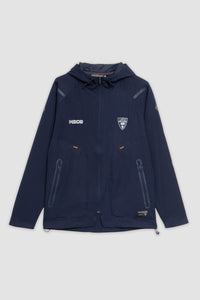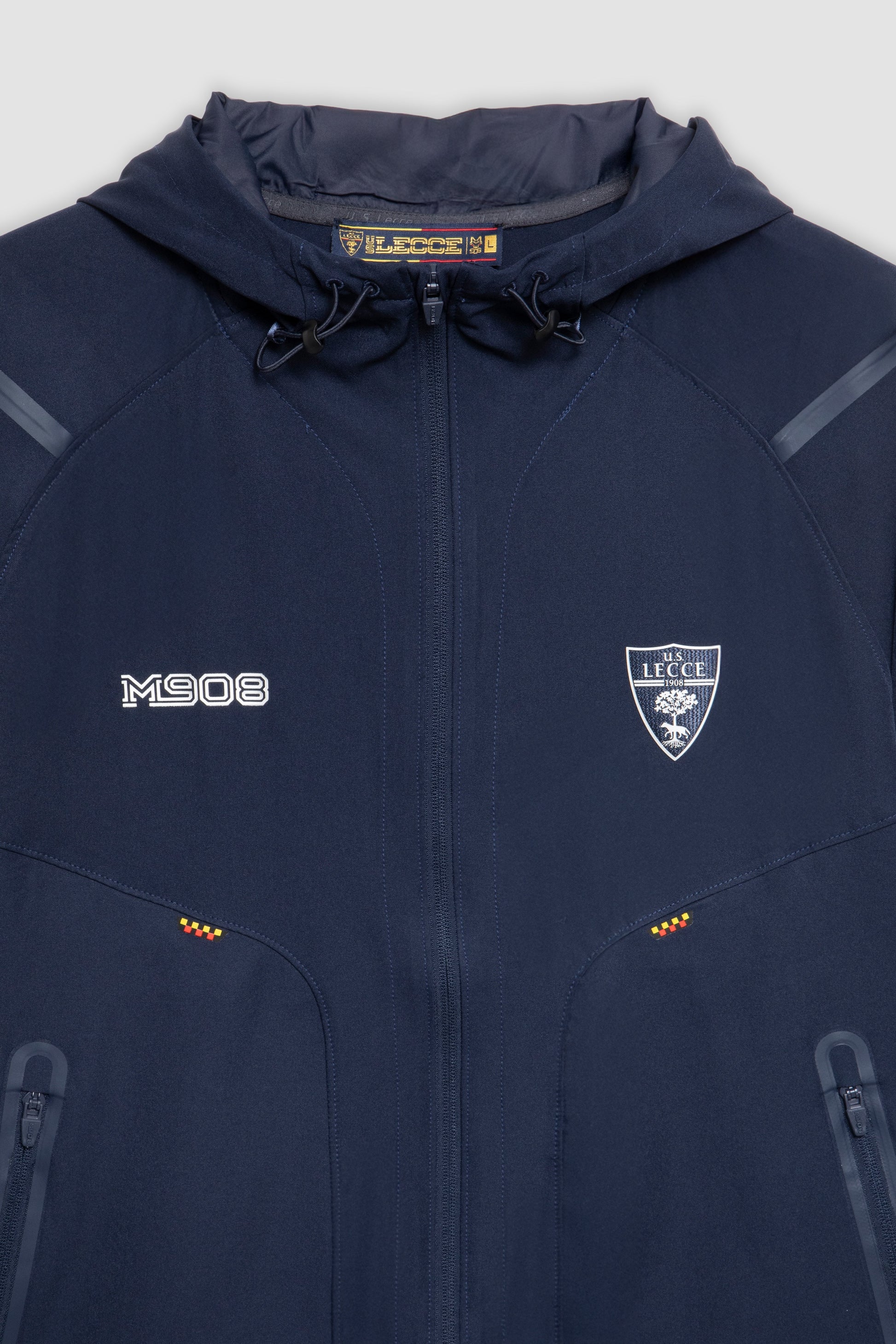 A jacket made from technical navy blue fabric, offering a structured and comfortable fit. This model features a full-zip front, an adjustable hood, and front zip pockets for maximum practicality.