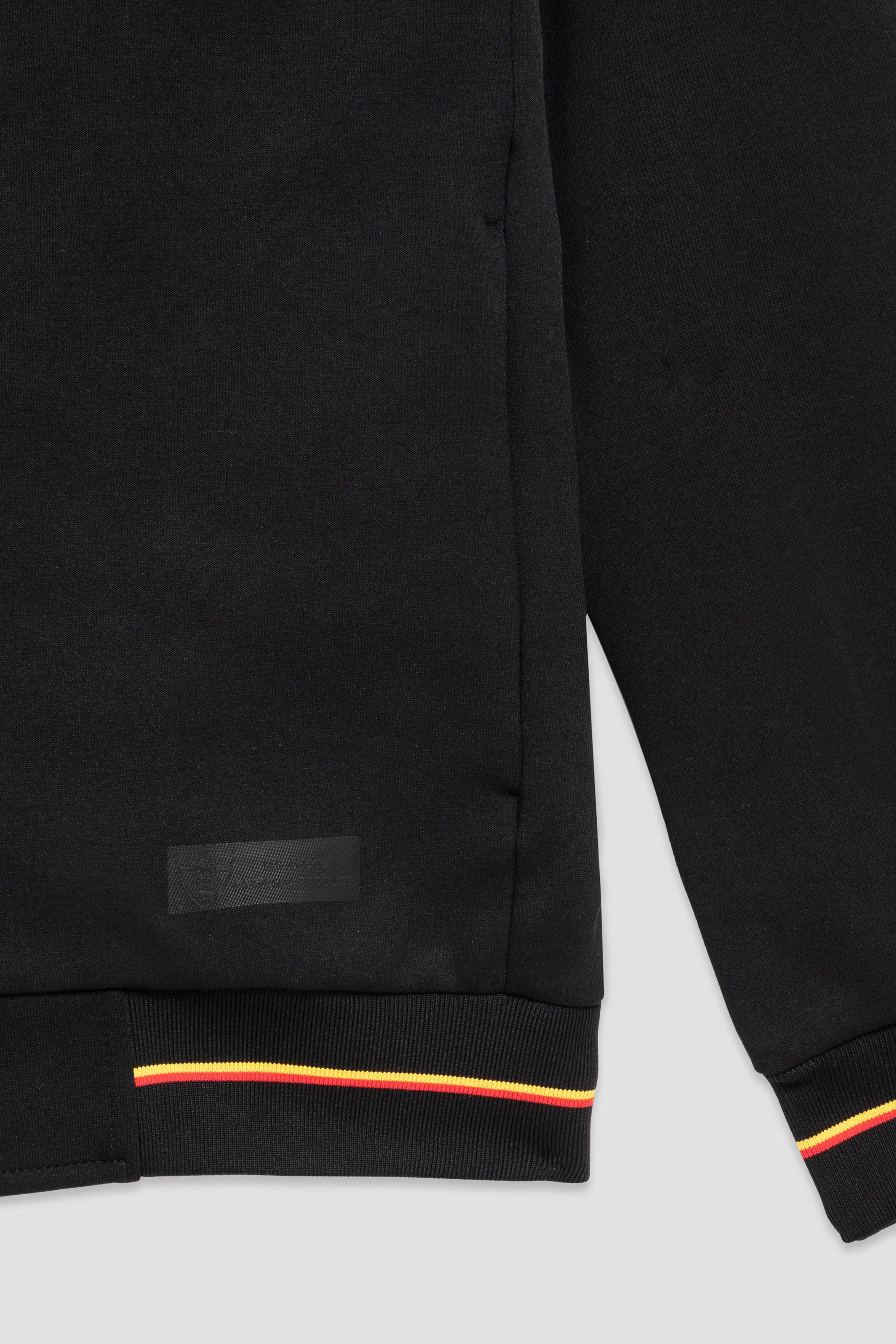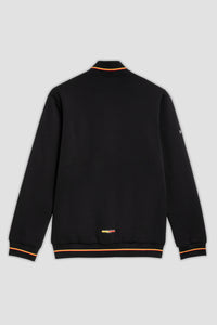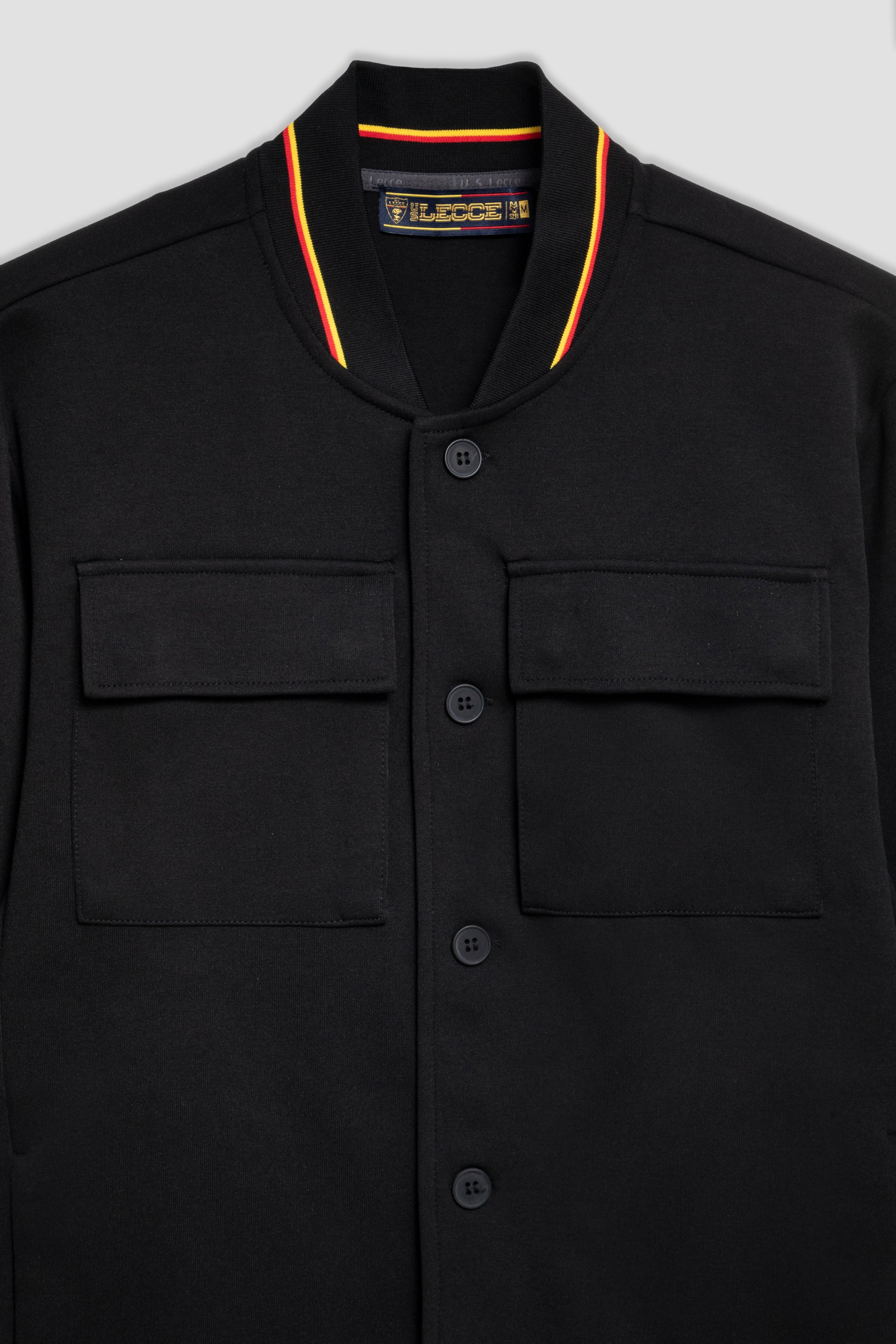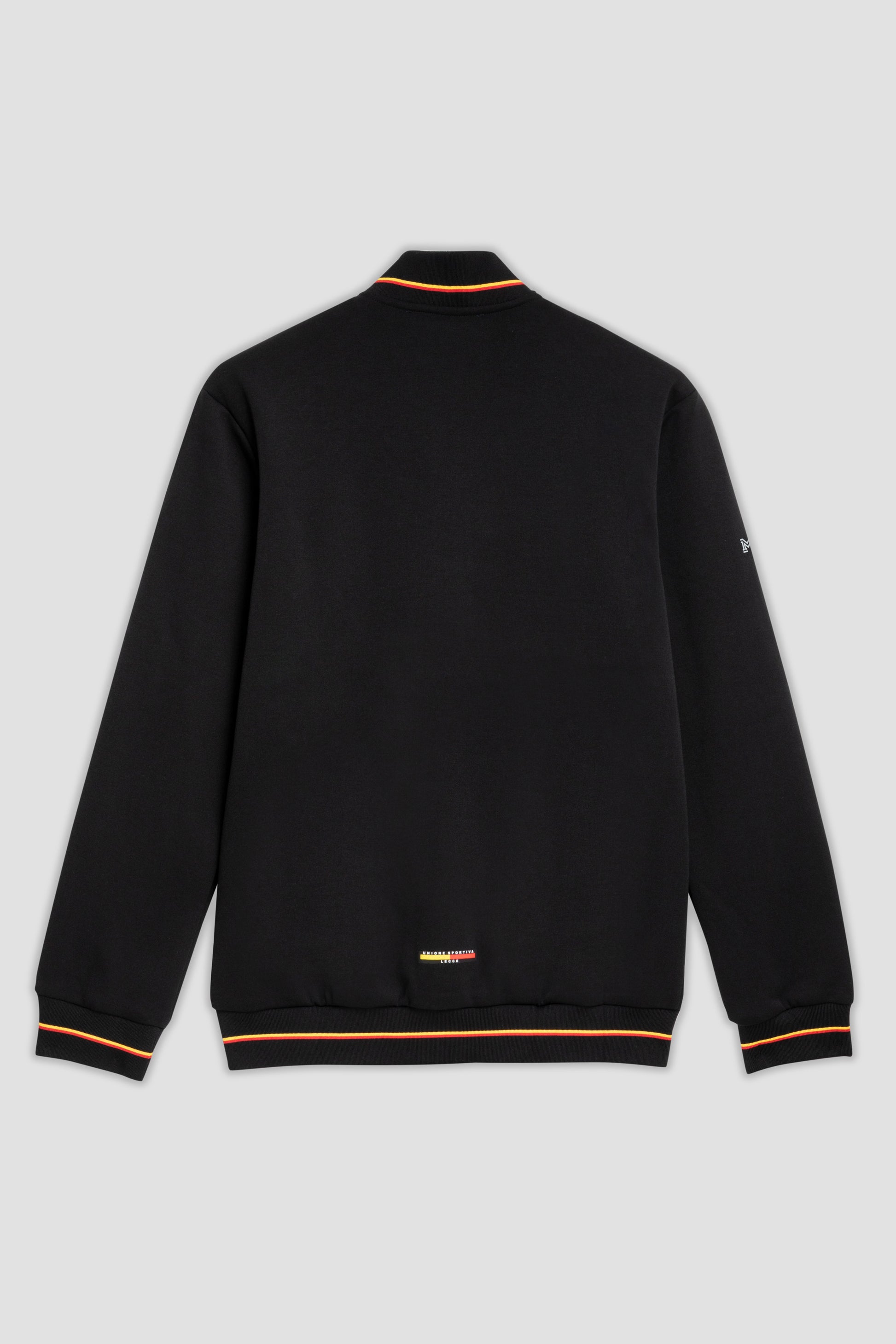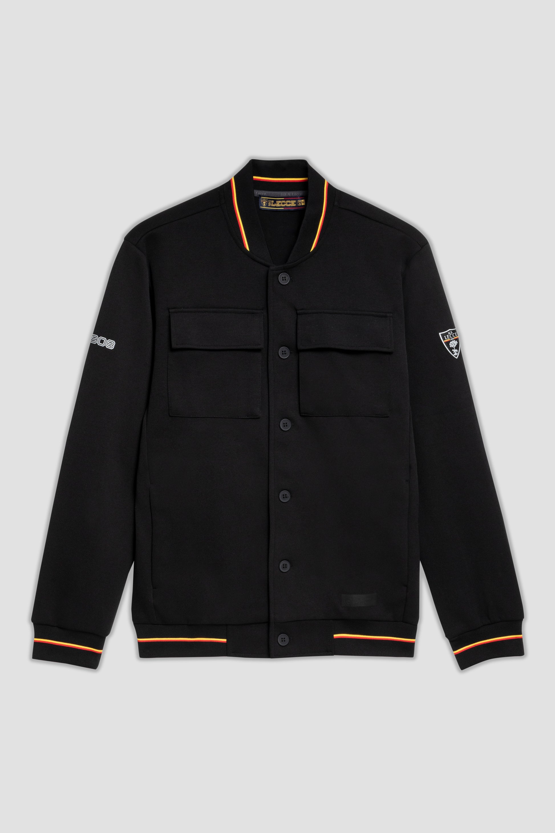 Felpa di colore nero in stile bomber che si distingue per la chiusura a bottoni e le due ampie tasche frontali con patta. I dettagli a costine su colletto, polsini e orlo sono rifiniti da strisce giallo-rosse e le maniche sono arricchite dallo stemma U.S. Lecce e dal logo M908.