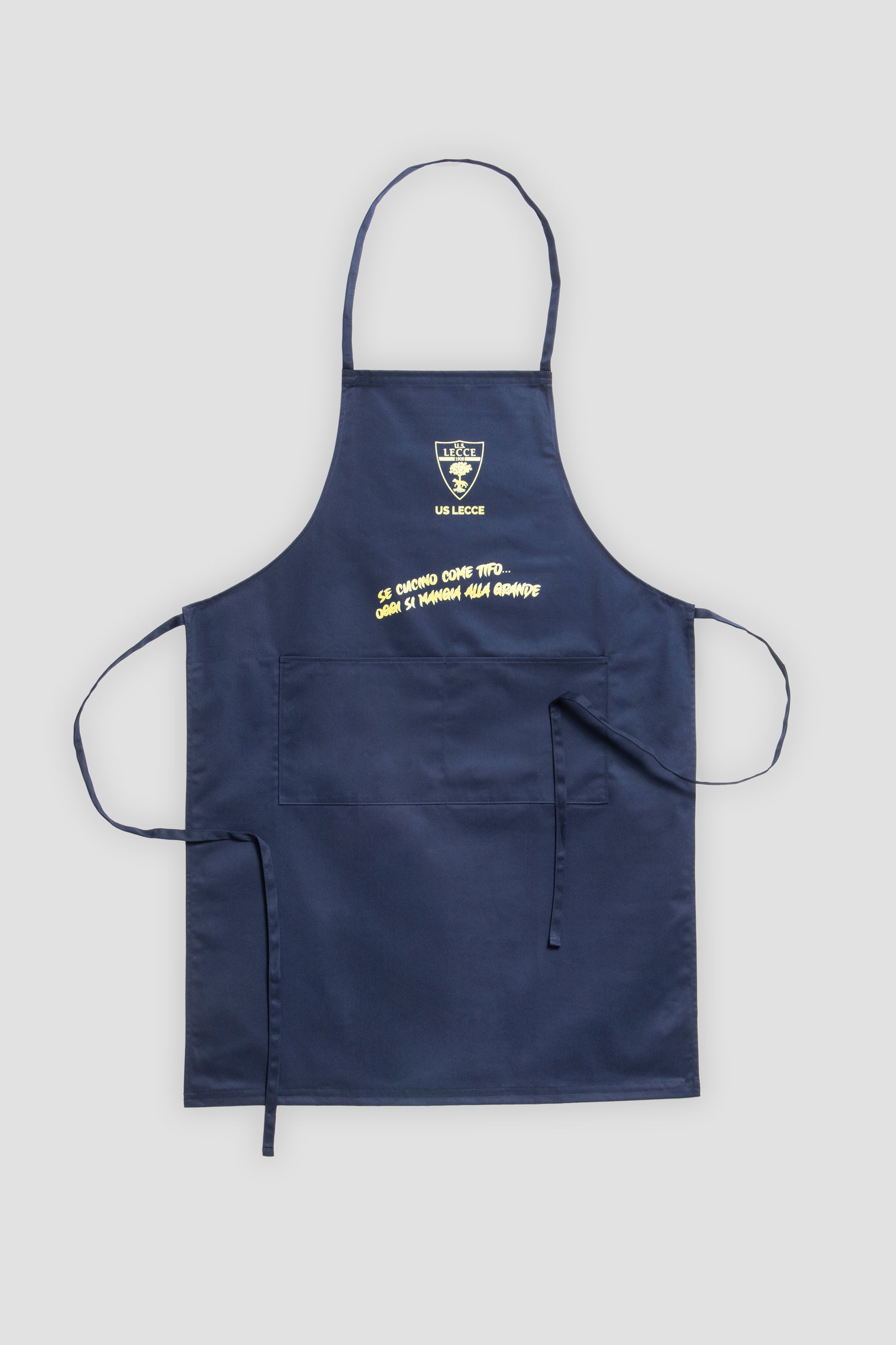 Realizzato in un colore blu scuro, il suo design classico include lacci ai fianchi e un'ampia tasca centrale. La stampa a contrasto sul petto include lo stemma U.S. Lecce e il dettaglio che rende unico questo accessorio: "se cucino come tifo...oggi si mangia alla grande "