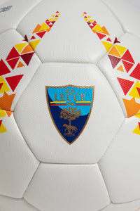 Pallone bianco, giallo e rosso nella dimensione standard ufficiale.