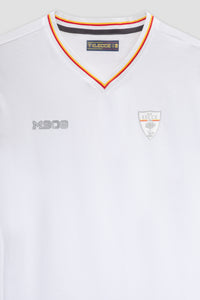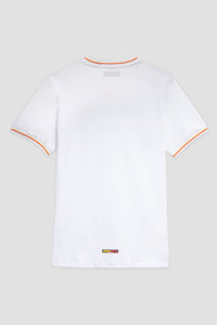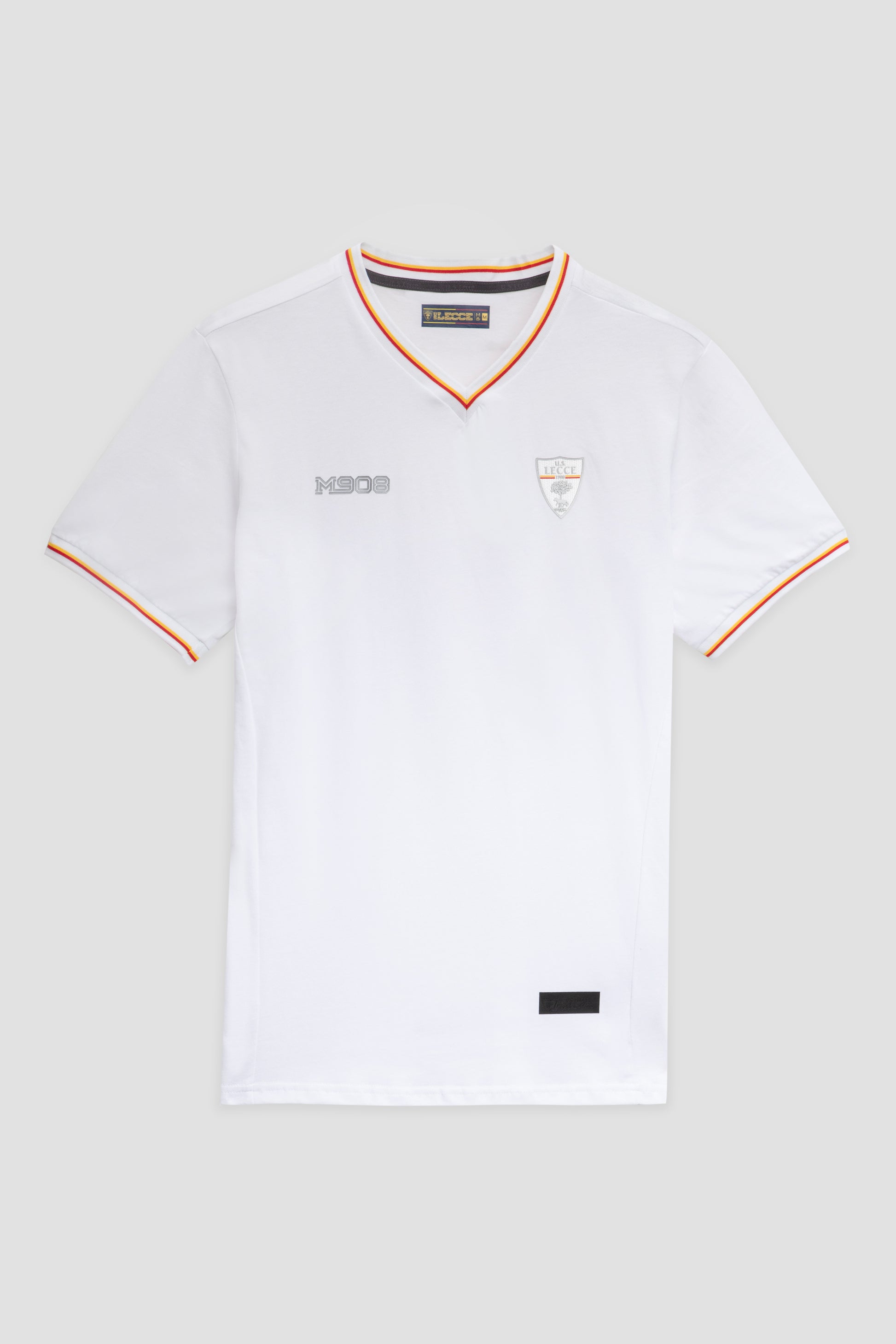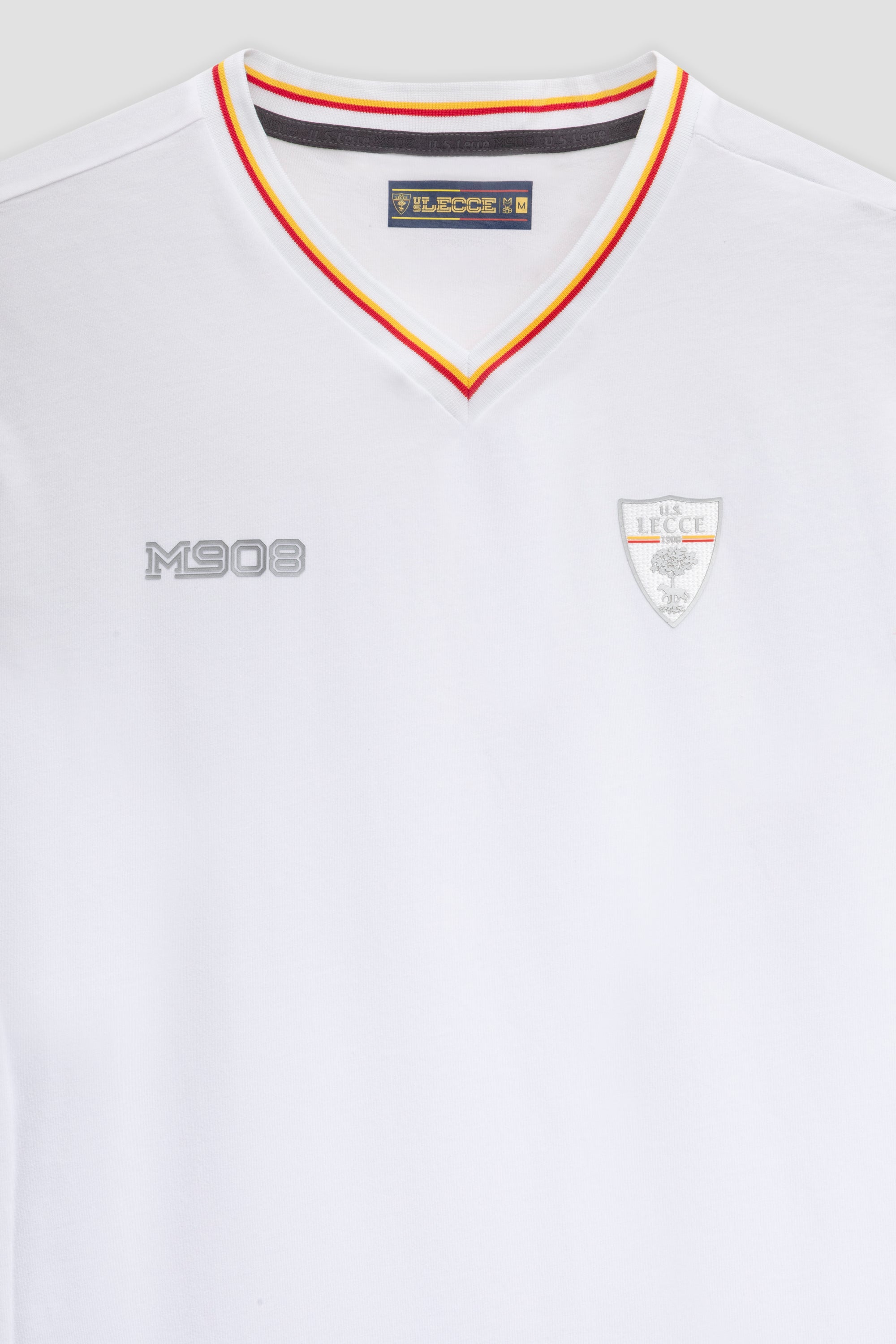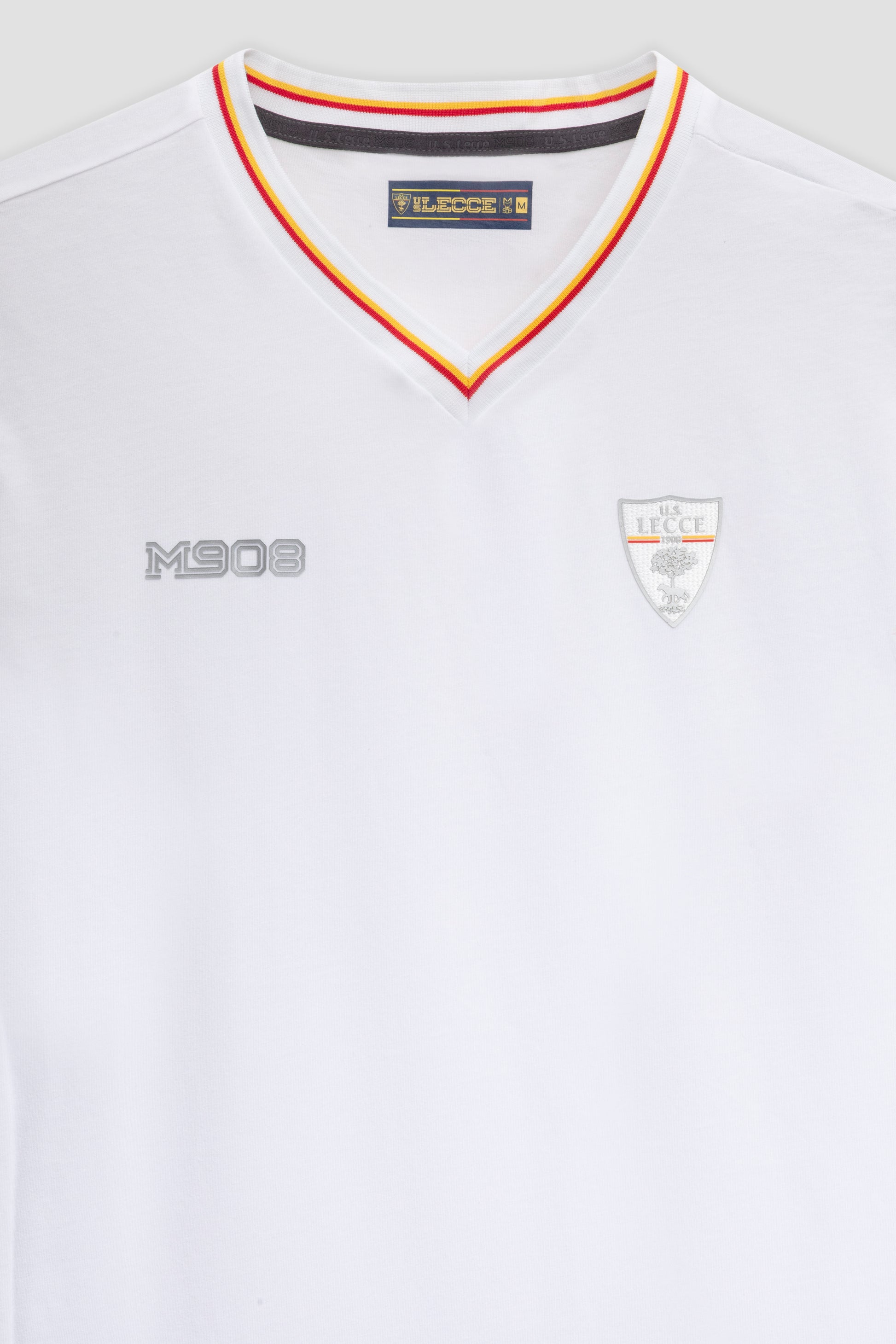 T-shirt bianca dal design essenziale che celebra i colori del club con eleganza. Le maniche e lo scollo a V sono arricchiti da dettagli giallo-rossi mentre sul petto sono applicati il logo M908 e lo stemma U.S. Lecce tono su tono.