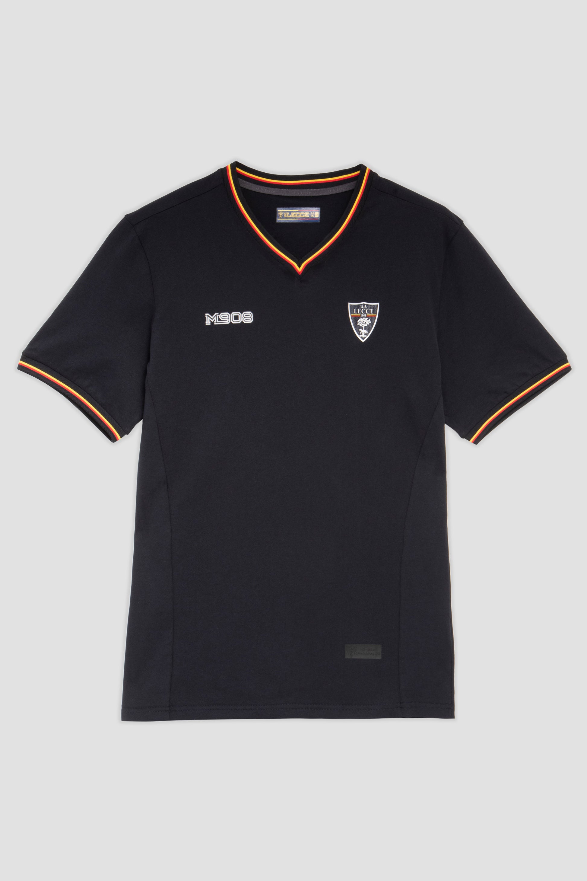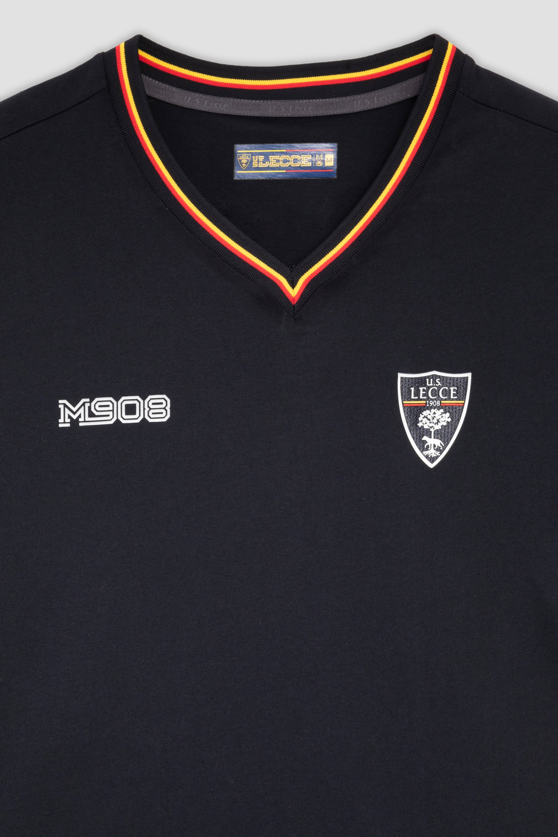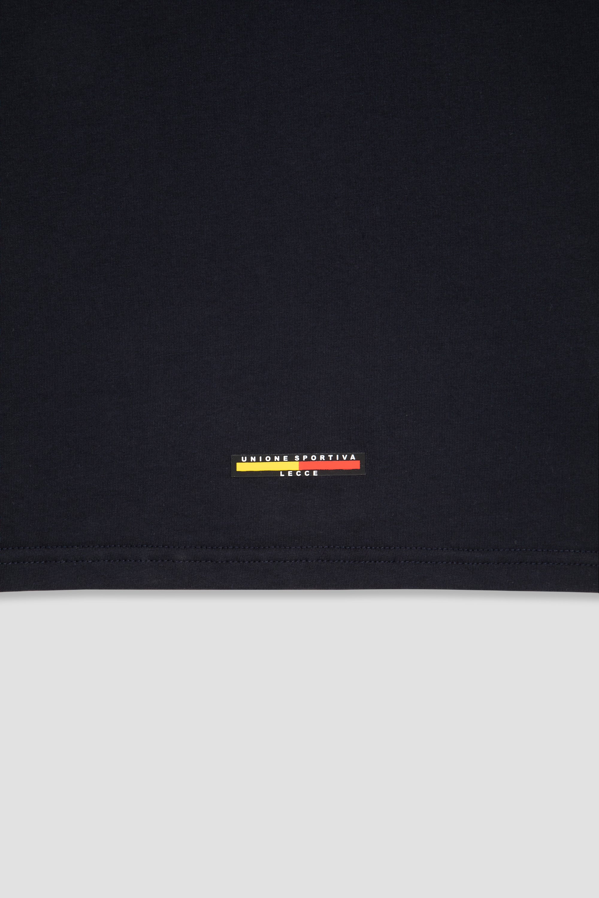 T-shirt blu navy dal design essenziale che celebra i colori del club con eleganza. Le maniche e lo scollo a V sono arricchiti da dettagli giallo-rossi mentre sul petto sono applicati il logo M908 e lo stemma U.S. Lecce in colore bianco.
