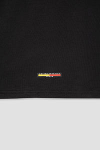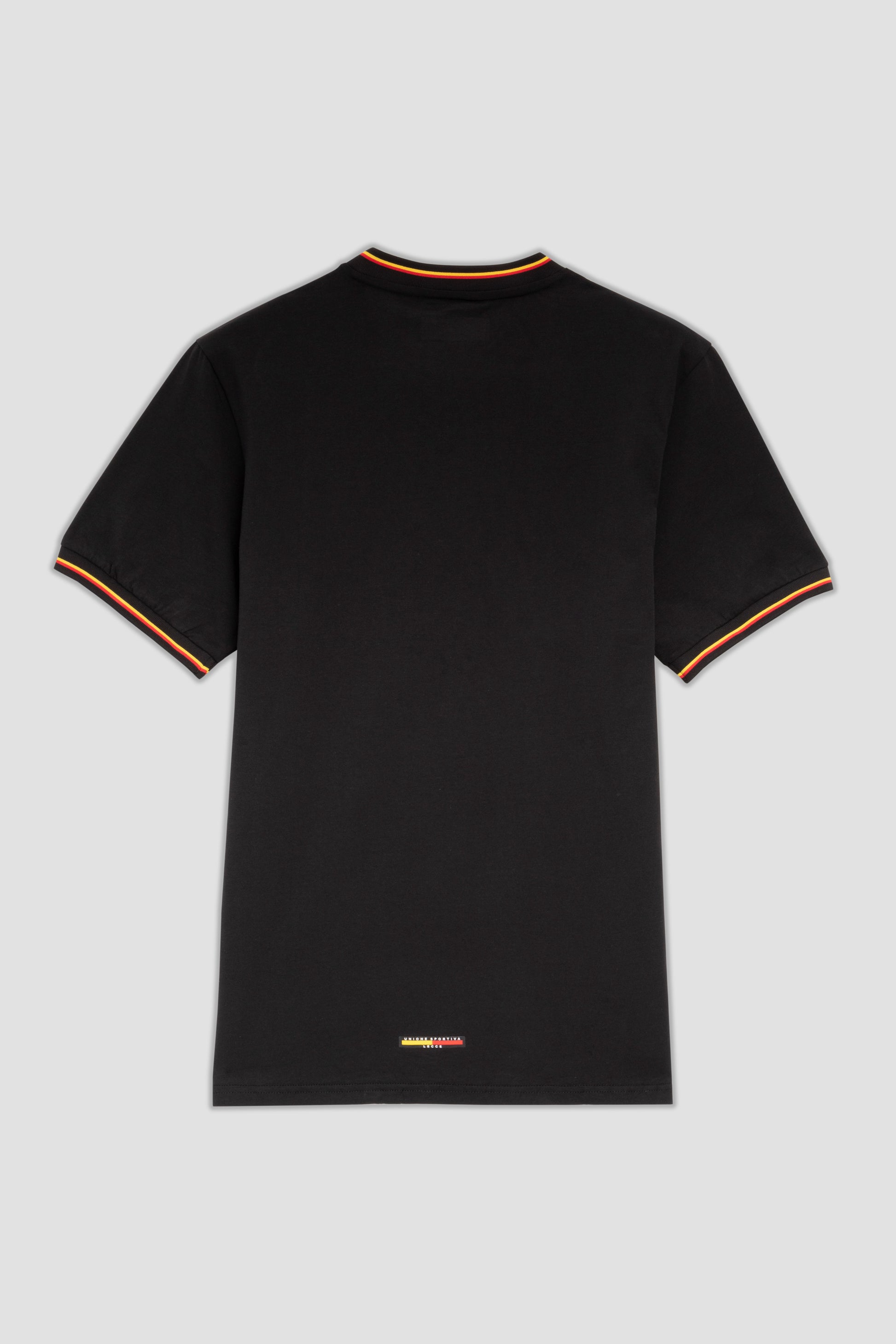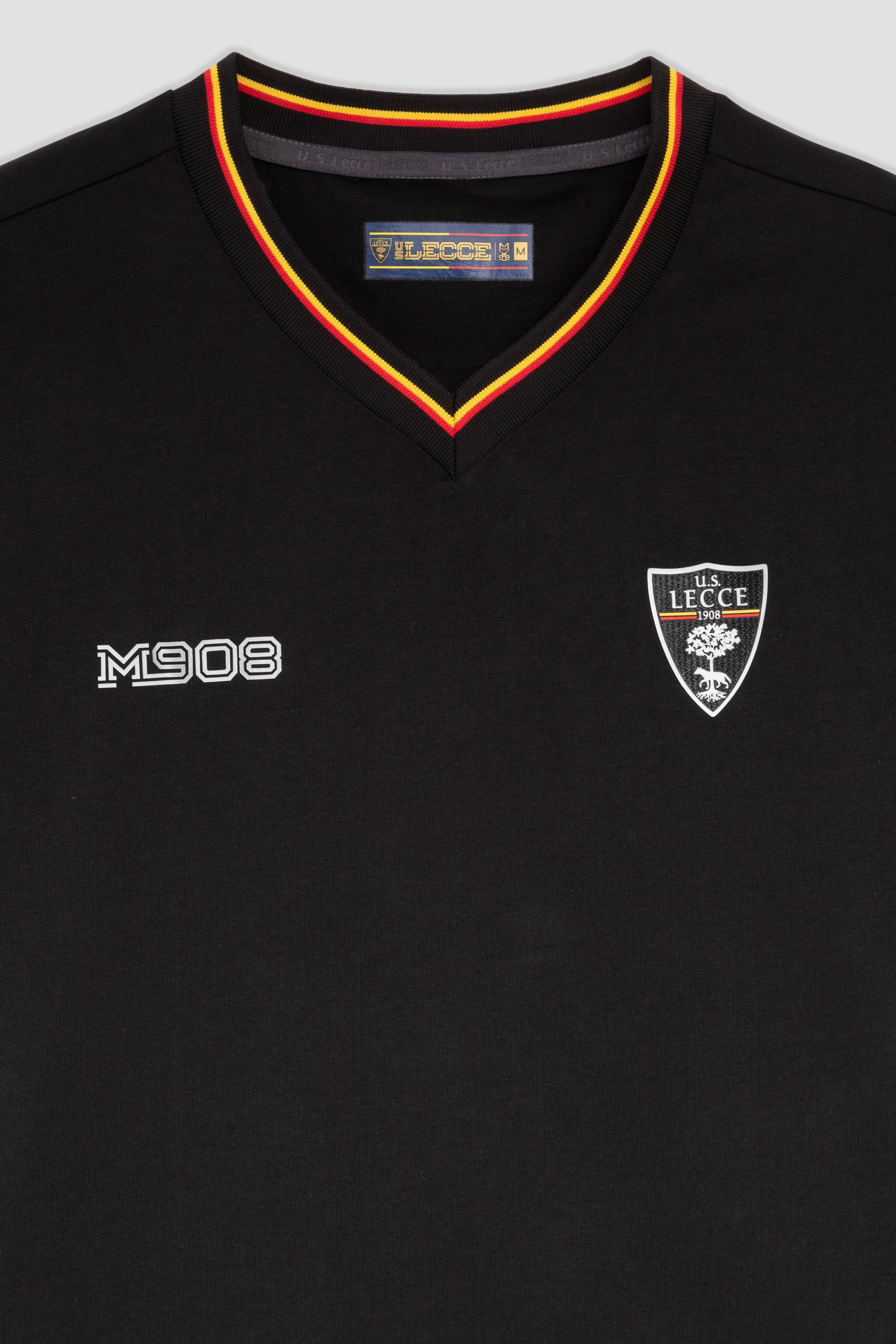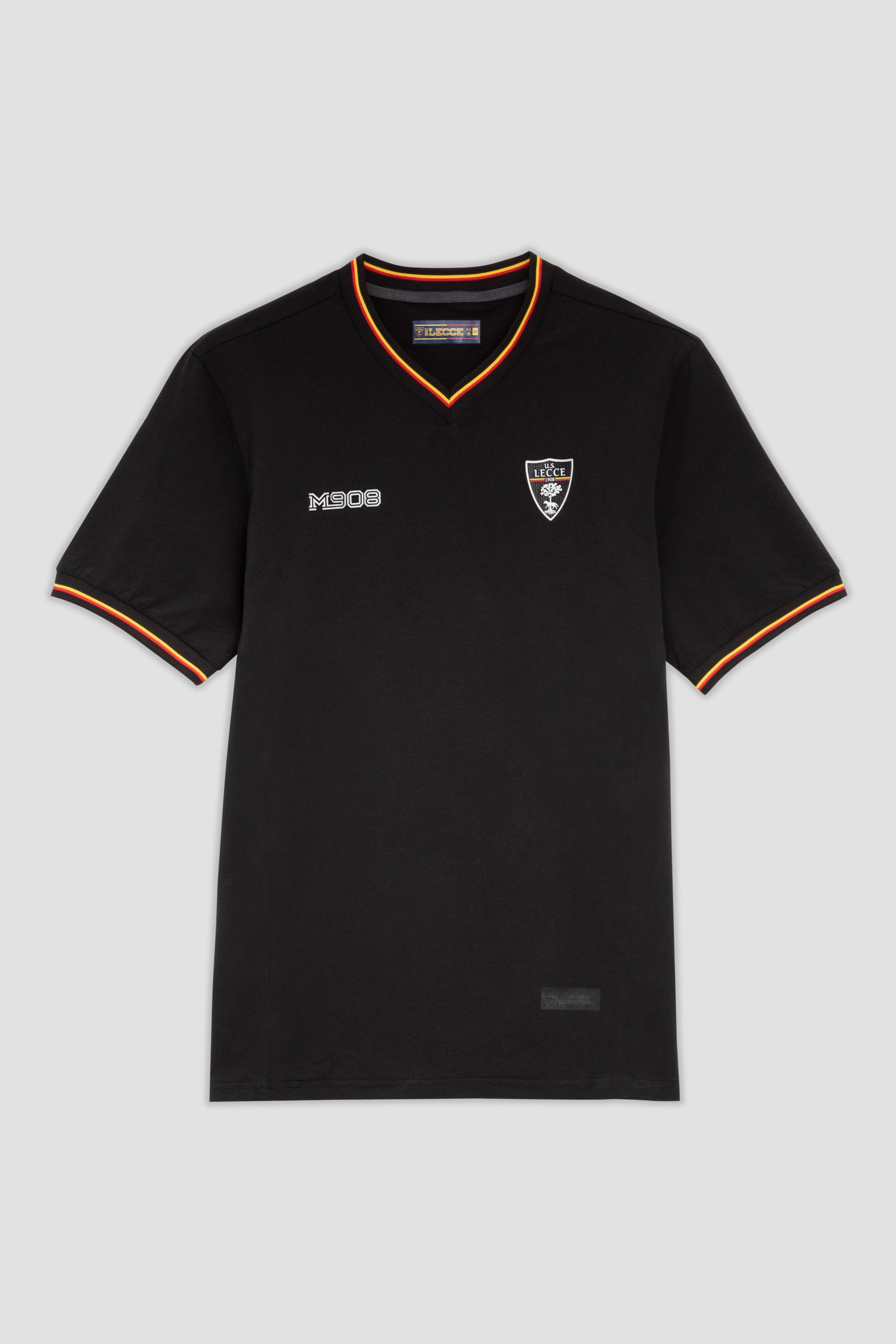 T-shirt nera dal design essenziale che celebra i colori del club con eleganza. Le maniche e lo scollo a V sono arricchiti da dettagli giallo-rossi mentre sul petto sono applicati il logo M908 e lo stemma U.S. Lecce in colore bianco.